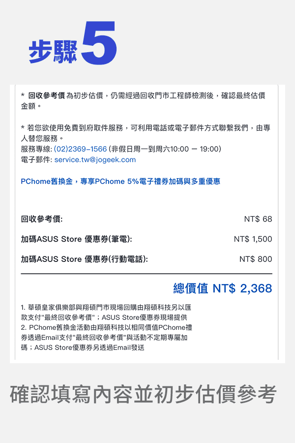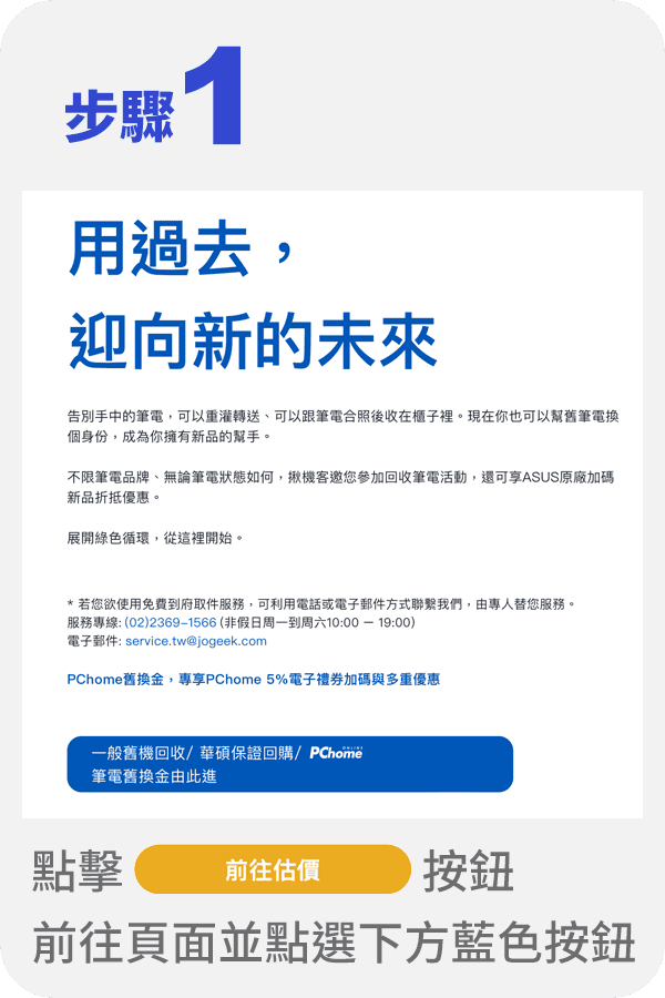 2.先至PChome買ASUS指定筆電,並在翔碩回收指定規格舊機,完成交易後主動聯繫 service.tw@jogeek.com 並提供訂單編號、發票影本及新品機身序號,確認身分後,除原本舊機回收金額,加碼再送1,000 PChome禮券(新機購買與舊機回收期間需在30天內)。