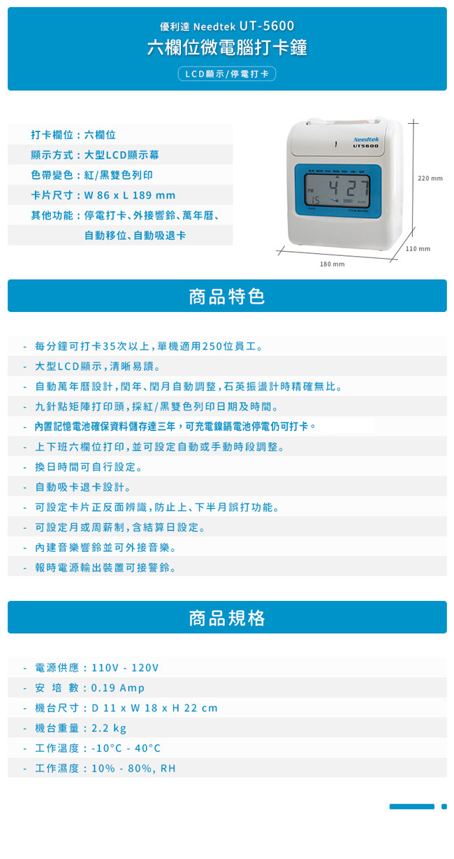 電源供應:台灣110V~120V 安培數:0.19 Amp 機台尺寸:11 x 18 x 22cm3(D x W x H) 機台重量:2.2 kgs( UT-5600) 工作溫度:-10oc~40oc 工作濕度:10%~80%, RH 卡片尺寸:86 mm x 189 mm(W x L)