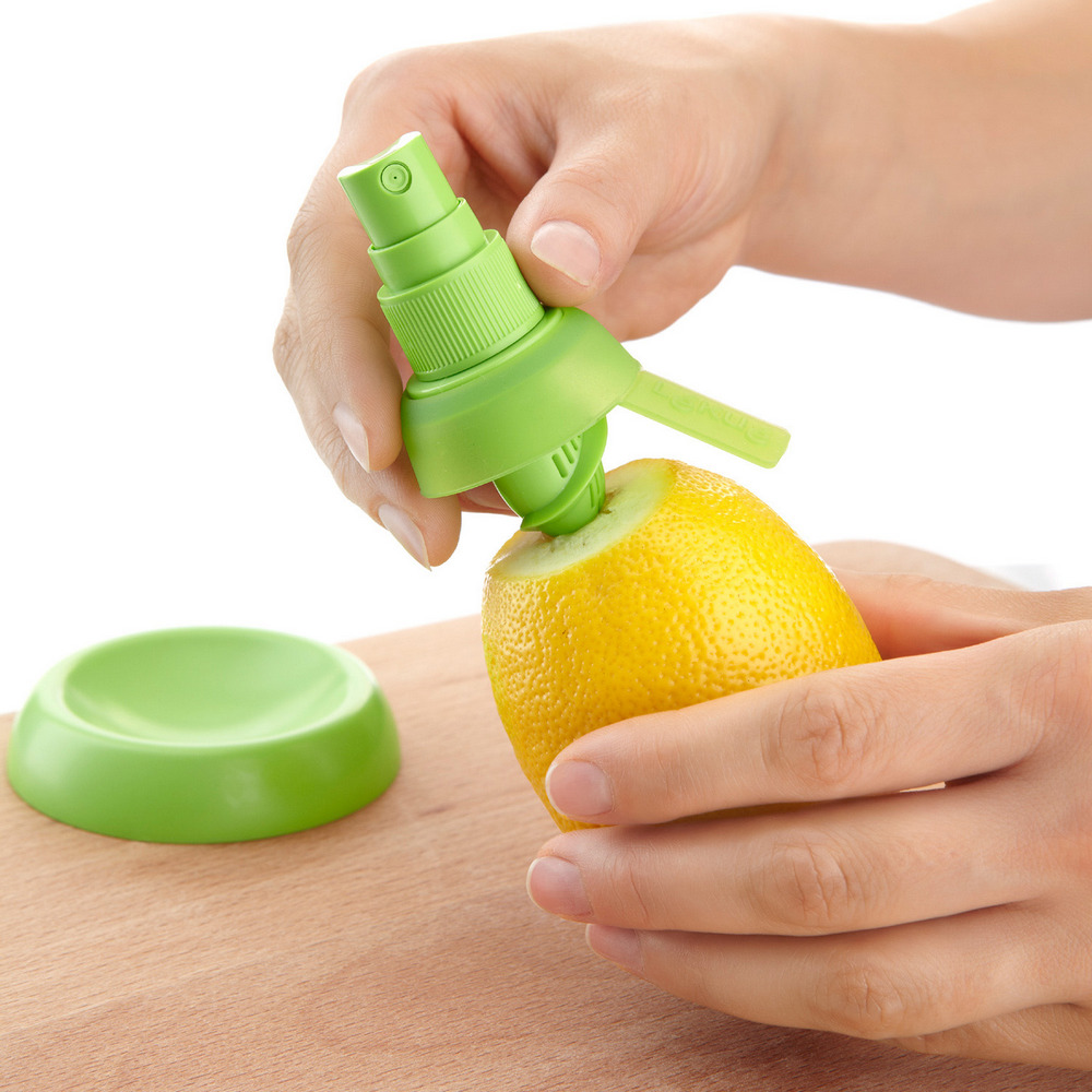 本商品一件入(大小鑽頭各一、附一底座),耐熱度 -45~80 度C (請遠離直接火源)、適用冰箱、洗碗機。擠榨檸檬最怕的就是檸檬汁噴濺四處,此款創意的噴霧器,適用檸檬、柳橙等水果,可當作沙拉、生魚片、燒烤、調酒等調味使用。首先於頂端先於接近果肉處橫切一刀,接著將噴霧器向下壓並旋轉,固定後即可噴出新鮮的果汁囉。若檸檬還需下次使用,僅需直接將噴霧器與水果一併存放底座上,直接冷藏即可。保留果皮的水果,可延長保鮮度、避免水分蒸發。全組可拆卸,方便清洗替換。