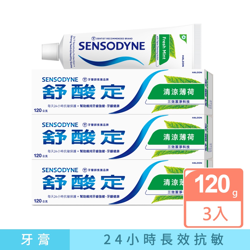 SENSODYNE舒酸定 【 長效抗敏-清涼薄荷 綠】清新好口氣-抗敏牙膏 120g x3入(新舊包裝隨機出貨)