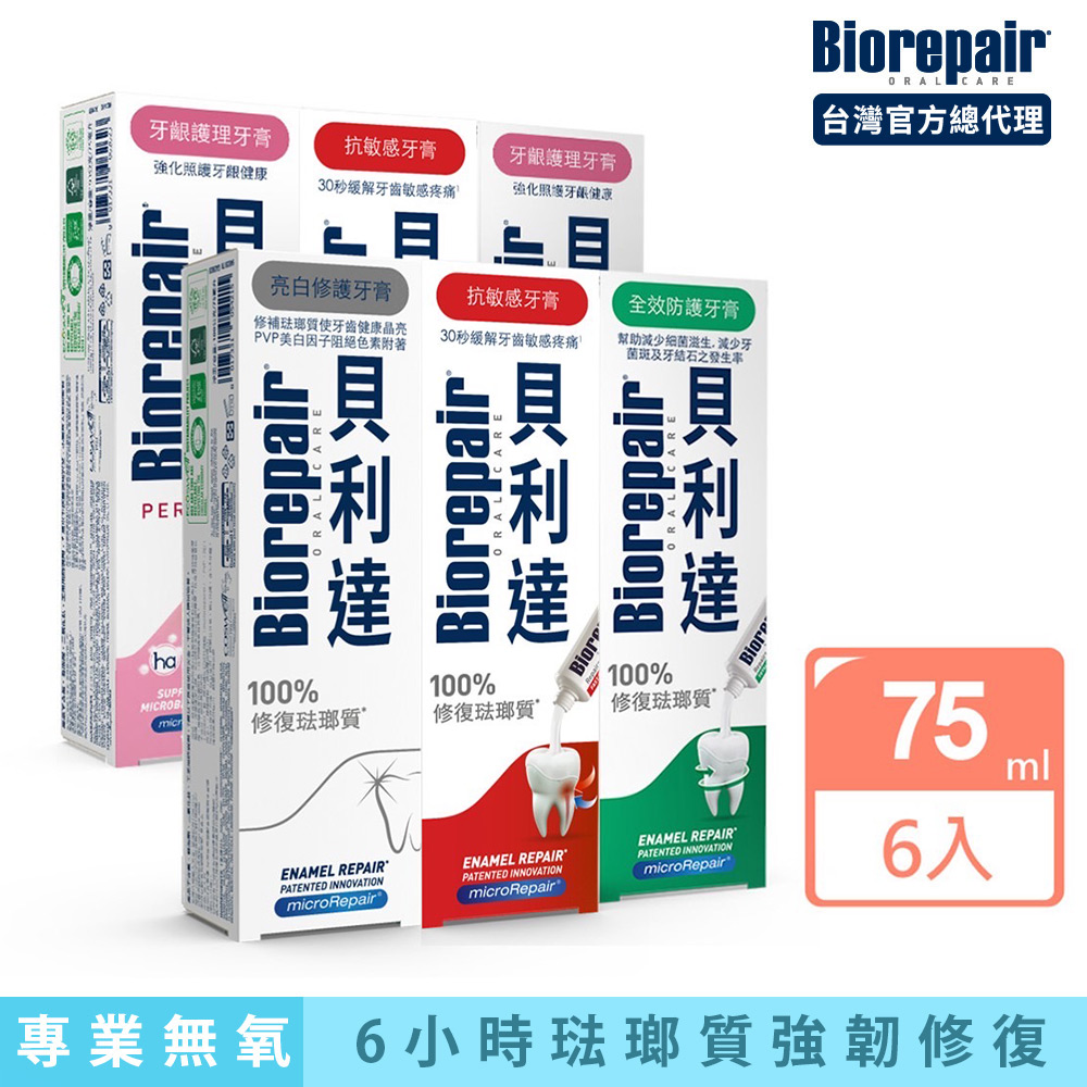 貝利達 牙膏 經典款 75ml x 6入 (全效防護/抗敏感/牙齦護理/亮白修護/益生菌)