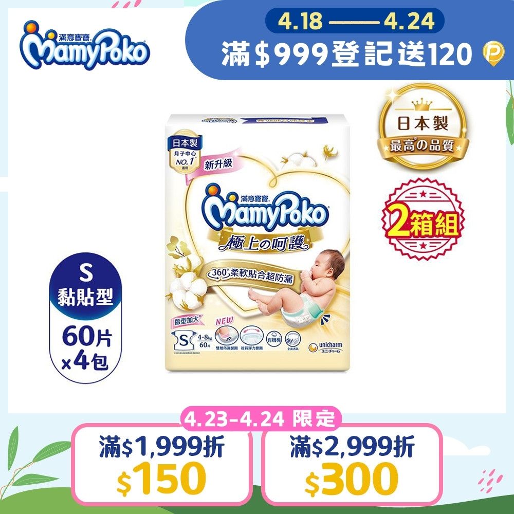 mamypoko 滿意寶寶 日本白金 極上呵護紙尿褲/尿布 黏貼型 (S) (60片x4包x2箱)