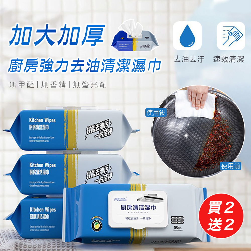 包裝內容物:(買2送2)加大加厚廚房強力去油清潔濕巾(80片/包)=4包320片