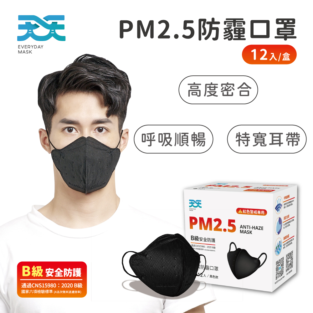 天天 PM2.5 防霾口罩 新B級防護 紅色警戒專用 L尺寸 12入/盒 (黑色)
