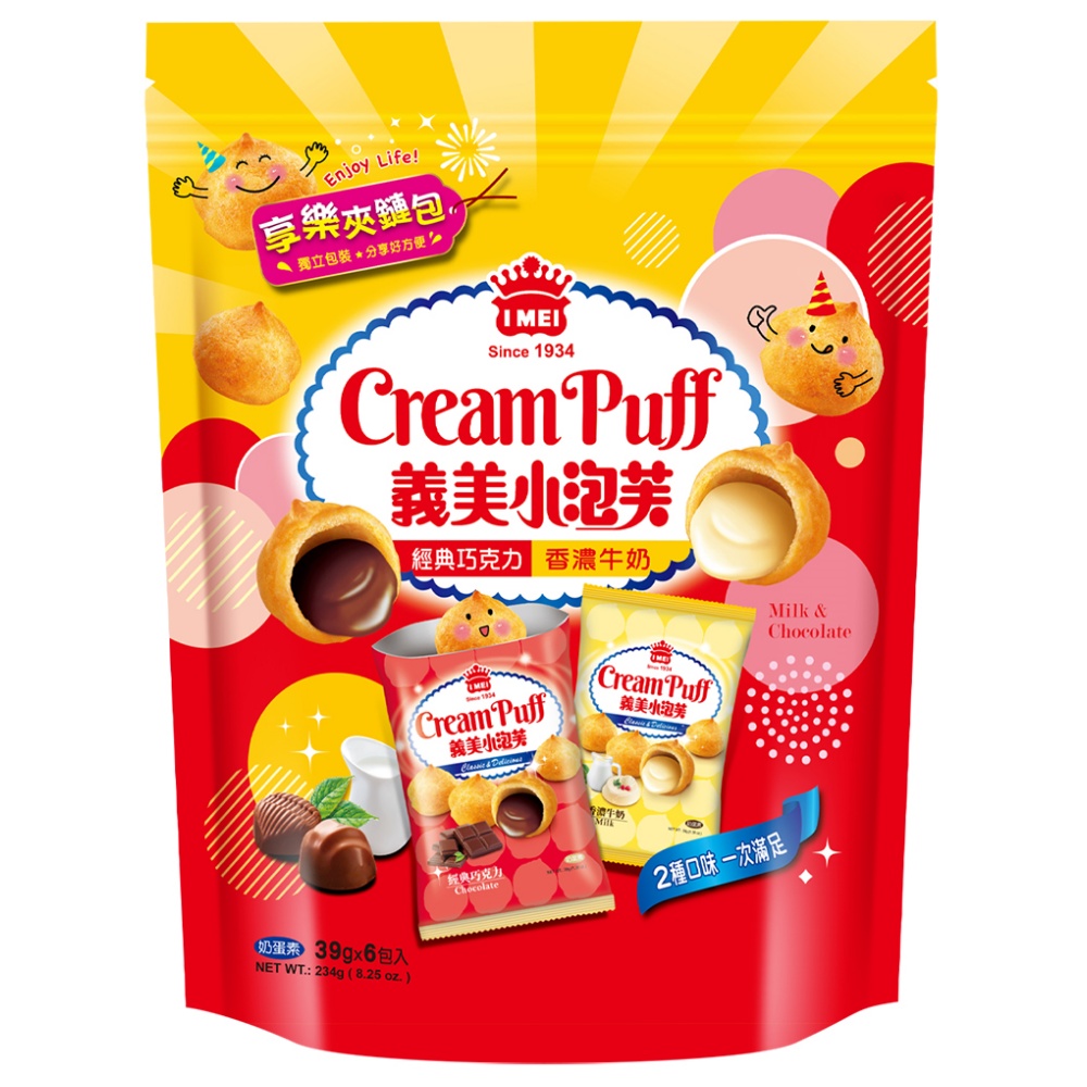 義美 小泡芙享樂夾鏈包234g x3包 〔 經典巧克力+香濃牛奶 〕