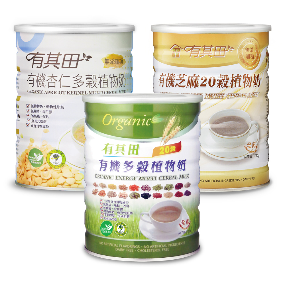 成分:非基因改造有機黃豆(美國、加拿大、台灣)、有機光中杏(中國)、有機燕麥(台灣、芬蘭)、有機糙米、有機黑豆、有機綜合20穀粉(非基因改造有機黃豆、有機黑豆、有機黑麥、有機燕麥、有機珍珠大麥、有機小麥、有機小米、有機糙米、有機圓糯白米、有機紫麥片、有機紅扁豆、有機綠扁豆、有機黑糯糙米、有機綠豆、有機紅藜麥、有機黑藜麥、有機白藜麥、 有機亞麻仁籽、有機蕎麥、有機紅糯糙米) |