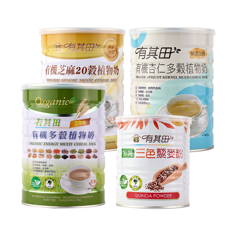 成分:非基因改造有機黃豆(美國、加拿大、台灣)、有機光中杏(中國)、有機燕麥(台灣、芬蘭)、有機糙米、有機黑豆、有機綜合20穀粉(非基因改造有機黃豆、有機黑豆、有機黑麥、有機燕麥、有機珍珠大麥、有機小麥、有機小米、有機糙米、有機圓糯白米、有機紫麥片、有機紅扁豆、有機綠扁豆、有機黑糯糙米、有機綠豆、有機紅藜麥、有機黑藜麥、有機白藜麥、 有機亞麻仁籽、有機蕎麥、有機紅糯糙米)