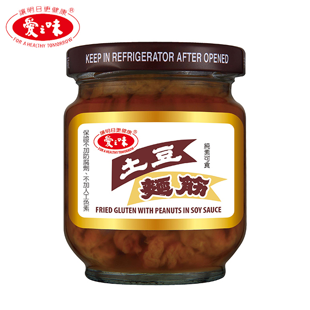 內容物成份:麵筋 花生 糖汁 醬油 水 鹽(納鹽\鉀鹽) 鮮味香菇汁(香菇原汁\昆布原汁\L-麩酸納\檸檬酸\5'次黃嘌吟核苔磷酸二納\5'鳥嘌吟核苔磷酸二納) 羧甲基纖維素鈉 甜味劑(甘草素)