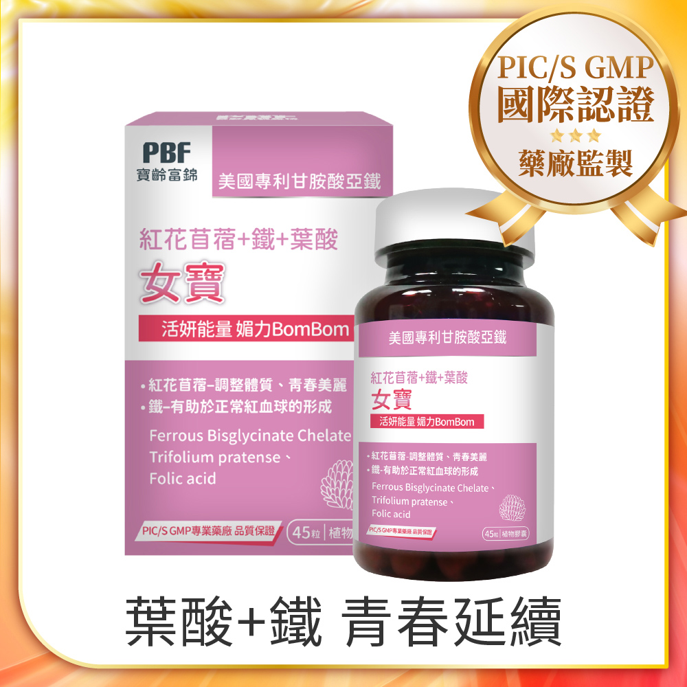 PBF 寶齡富錦 即期品 女寶加強版植物性膠囊 紅花苜蓿+鐵+葉酸 (45顆/盒)-效期至2026/5/30