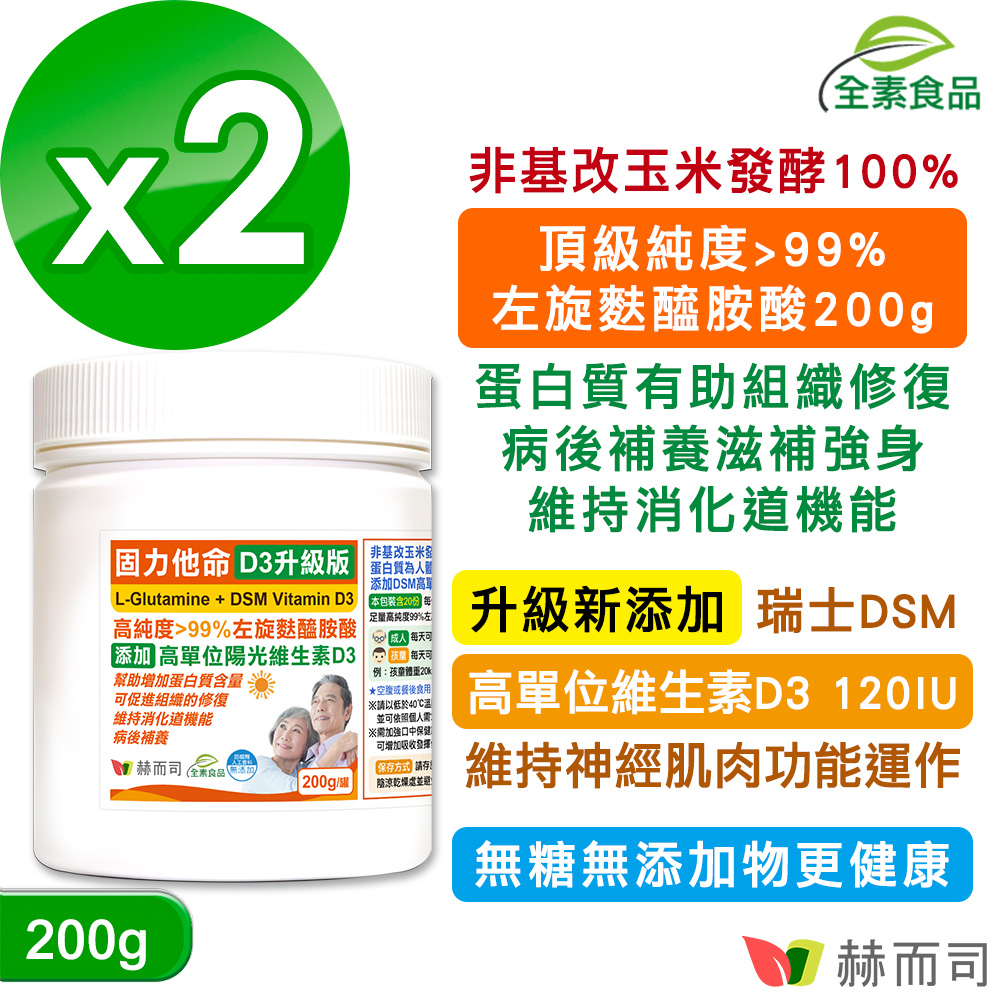 | 品名 | 固力他命D3升級版高純度99%左旋麩醯胺酸+瑞士DSM高單位維生素D3 120IU (200克*2罐) 全素食 |