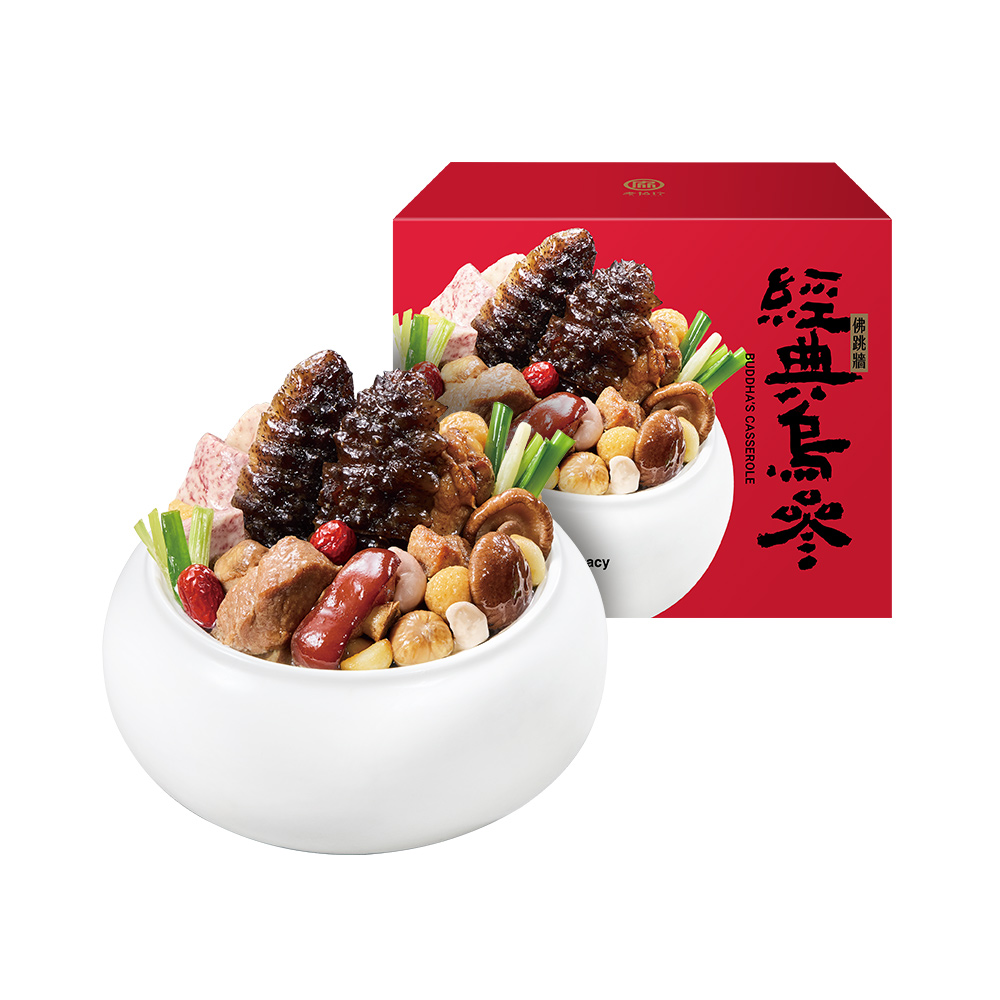 | 內容物名稱 | 水、排骨、海參、芋頭(芋頭.棕櫚油)、豬腳、雞肉、杏鮑菇、鵪鶉蛋、雞骨、栗子、醬油、蒜、菱角、米酒、紅棗、扁魚、冰糖、蔥、碘鹽、高麗菜、烏醋、大豆油、樹薯澱粉、香菇、豬皮、雞爪、油蔥酥(紅蔥頭.棕櫚油)、紹興酒、油炸油(棕櫚油.大豆油.芥花油)、酵母粉、酵母粉(酵母粉.柑橘粉)、鮑汁(水.鹽.鮑魚)、米霖[米麴發酵調味液(水.米.米麴.釀造酒精.釀造酢.鹽).甘蔗液糖.釀造酢.鹽]、糖、白胡椒粉、桂圓、米酒頭、蒜粉、五香粉(小茴香.肉桂.大茴香.丁香.花椒)、金華火腿(豬肉.鹽)、桂皮、八角 |