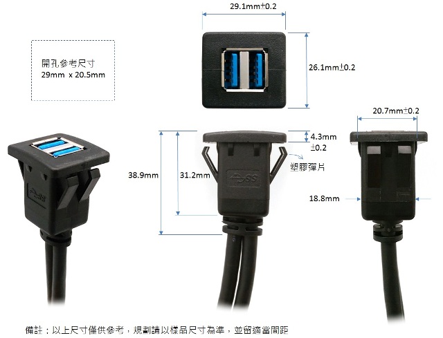 功能特點◆ 可以用於需要將USB3.0插座嵌入的位置◆ 嵌入位置需要先開孔,參考大小為 29mm x 20.5mm◆ 線材為USB3.0版本,向下相容USB2.0與1.1商品尺寸