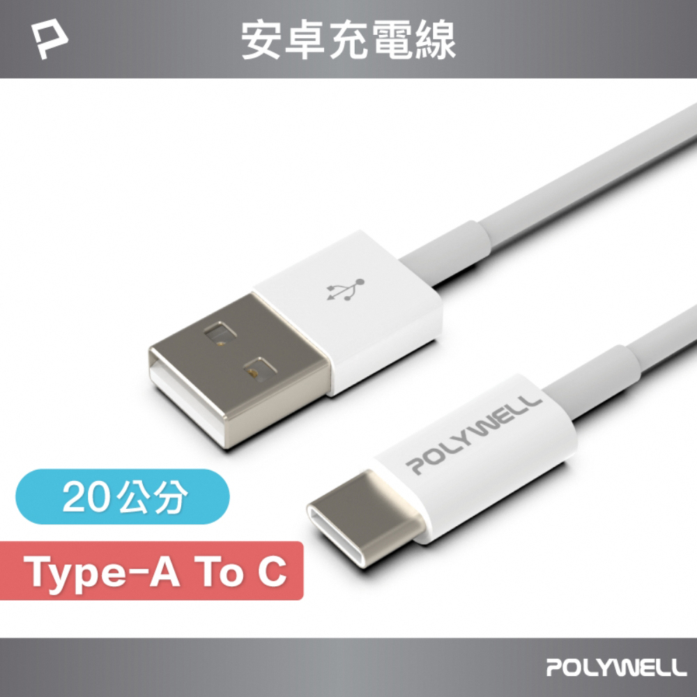POLYWELL 寶利威爾 USB Type-A To Type-C 3A 18W 充電傳輸線 20公分