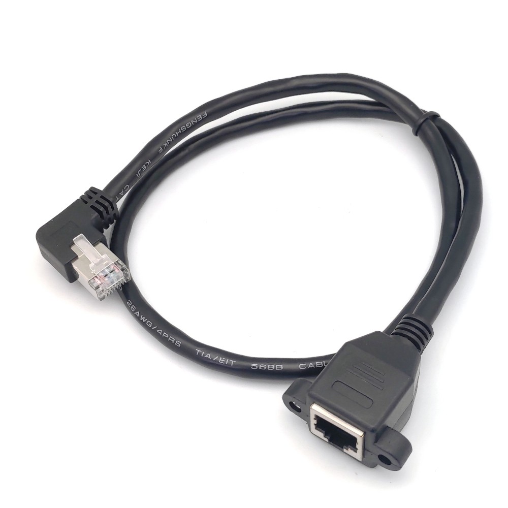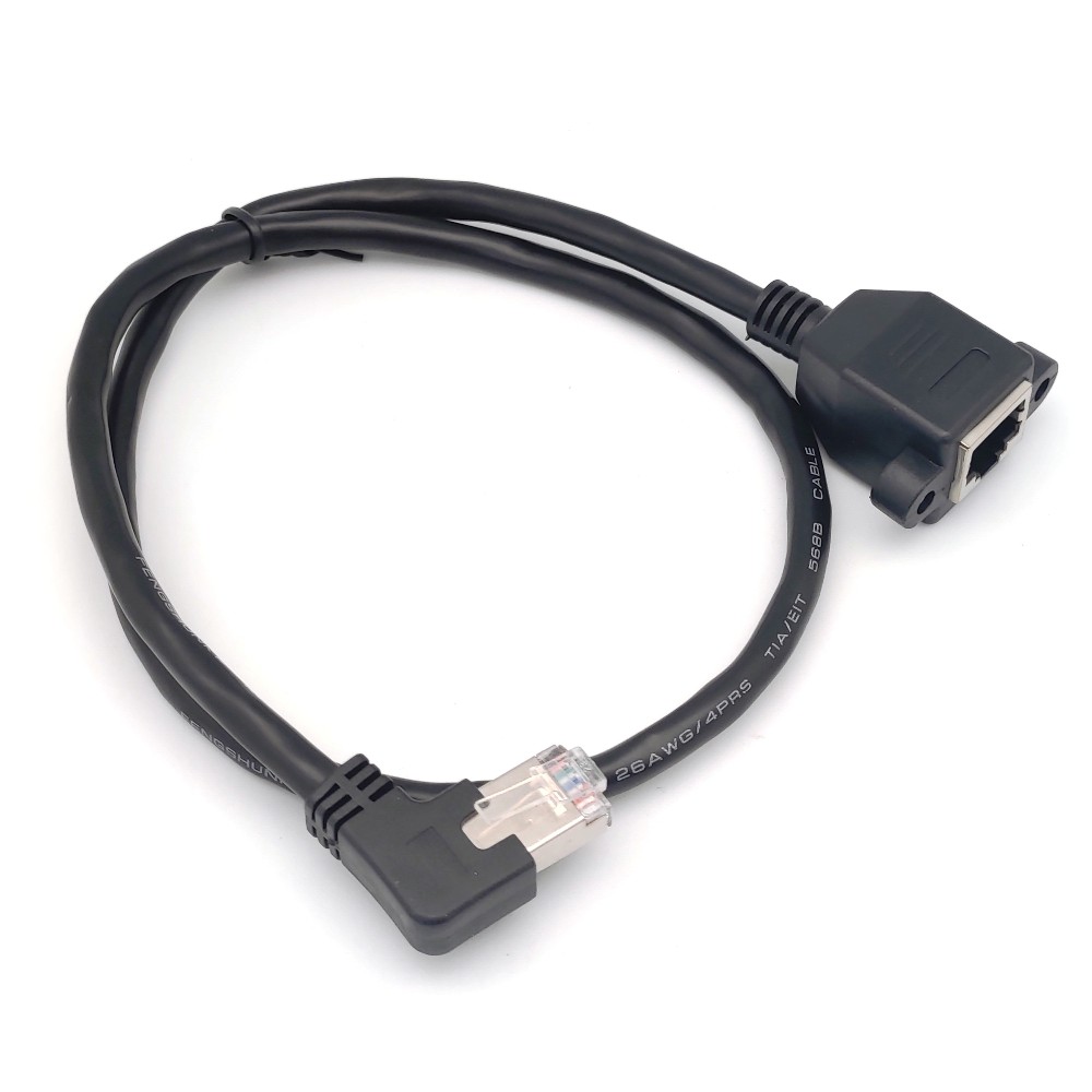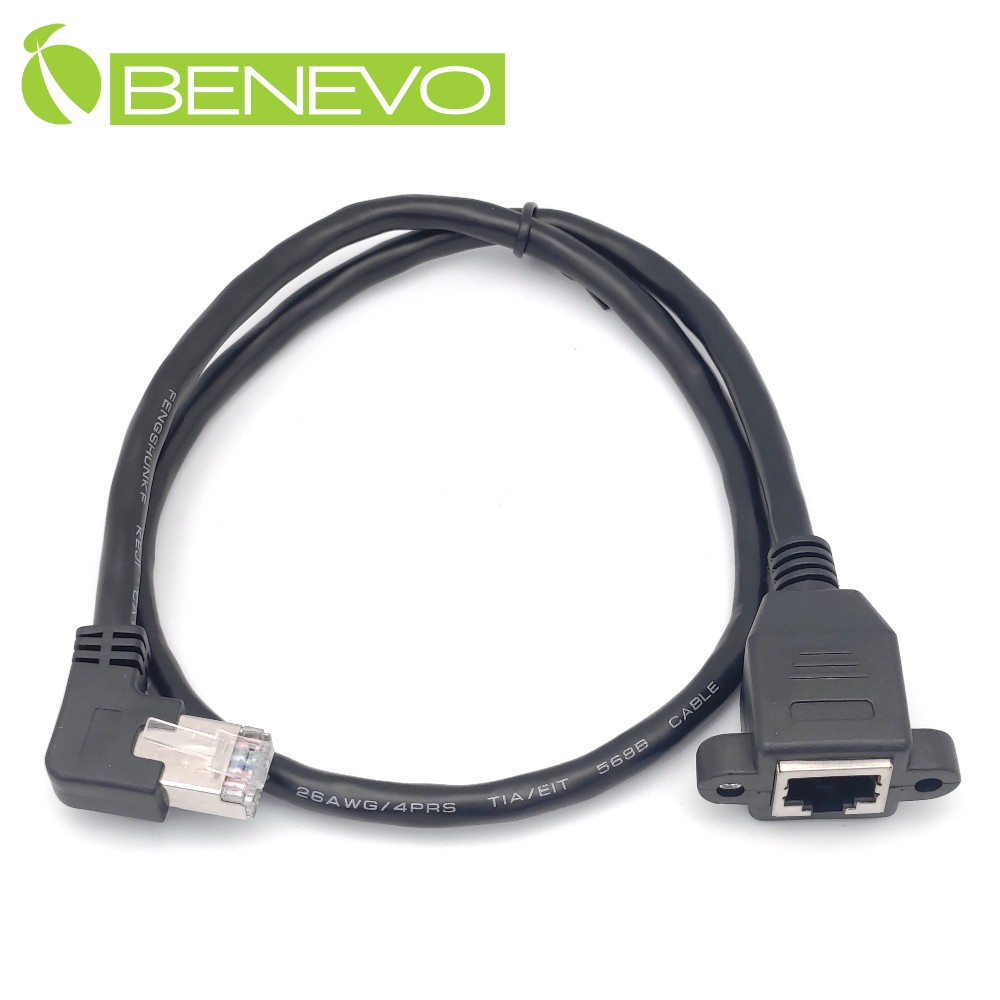- BENEVO可鎖左彎型 60cm Cat6遮蔽/十字隔離 RJ45接頭延長線(公對母,母頭帶螺絲孔)