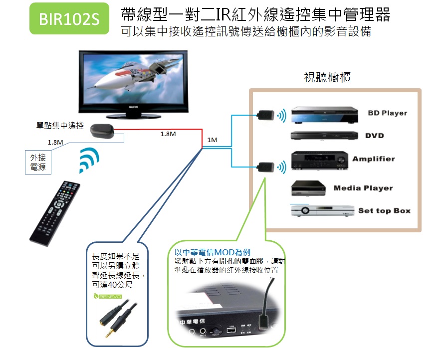 - 可以集中接收遙控訊號傳送給櫥櫃內的影音設備,遙控時不需打開櫥櫃