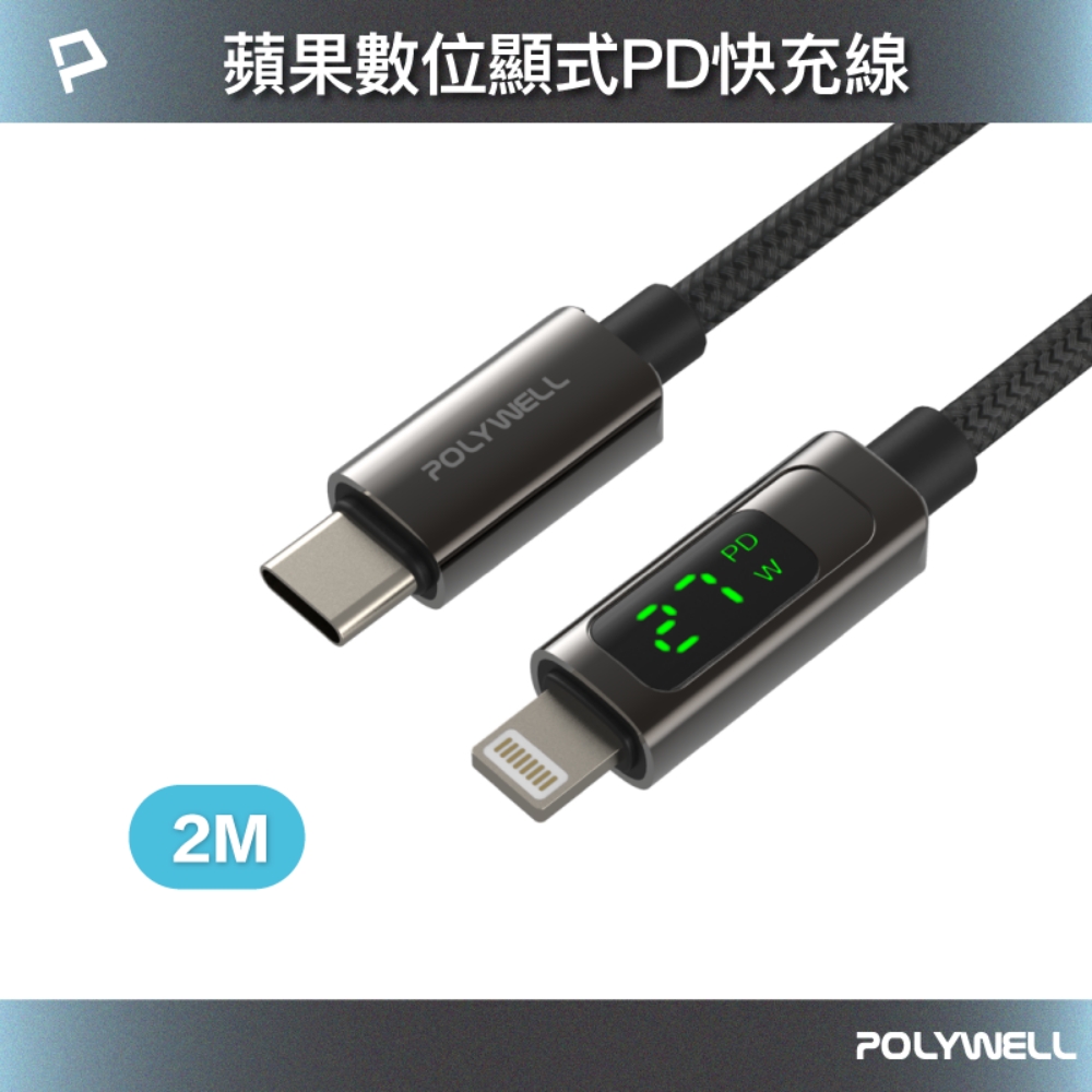 POLYWELL 寶利威爾 Lightning To Type-C 數位顯示PD快充線 /2M