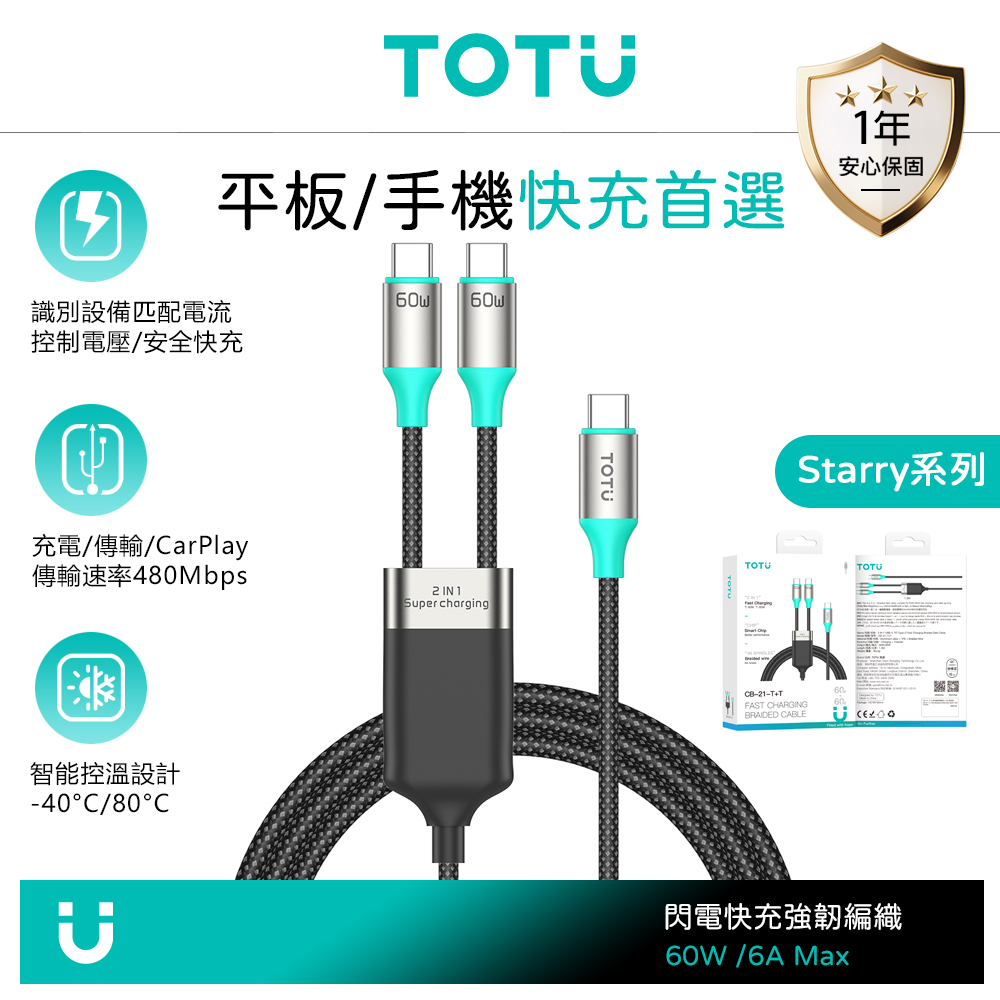 TOTU 一分二 USB-C TO Type-C PD 快充充電傳輸編織線 QC4.0 Starry系列 1.2M