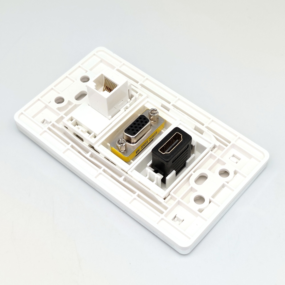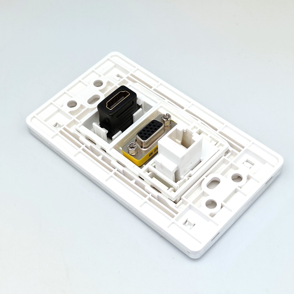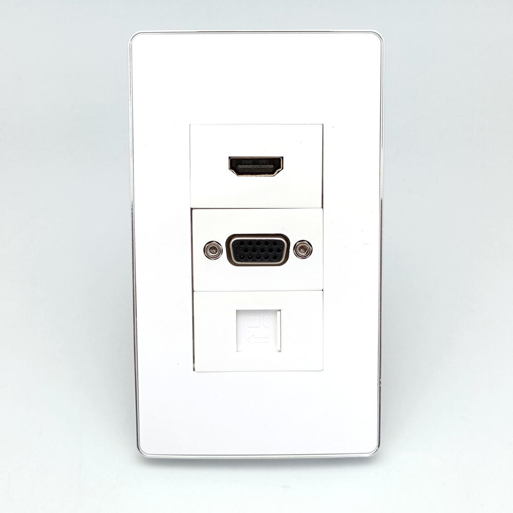 功能特點◆ 可用於壁插或是桌面設置資訊插座環境◆ 本款提供1個HDMI、1個VGA與1個Gigalan網路插座◆ 面板為白色,銀色邊框,有質感◆ 後側為母頭設計,可直接連接連接線◆ 免焊接與組合式設計◆ 包裝具備基本安裝用螺絲◆ 面板後側請留足夠深度以便設置連接線◆ 外框尺寸:寬約70mm,高約120mm◆ 安裝螺絲孔距84mm,可搭配120/118型配線盒