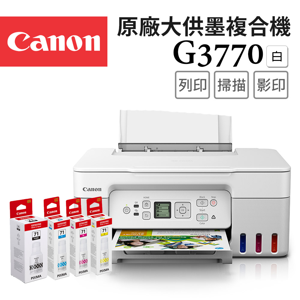 Canon PIXMA G3770 高速三合一Wi-Fi螢幕相片連續供墨印表機_白(W)+GI-71 PGBK/C/M/Y 墨水組(1組)