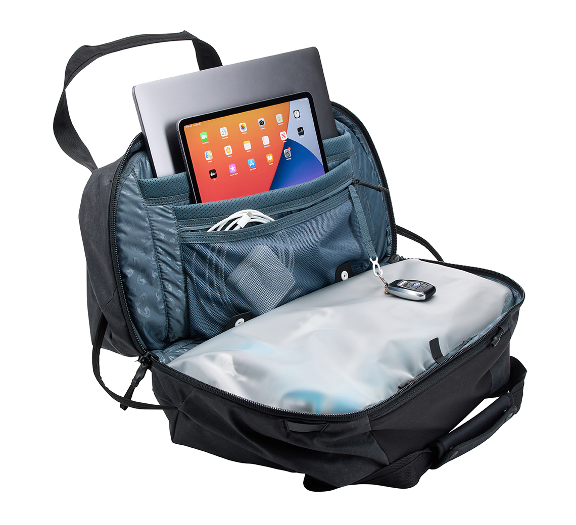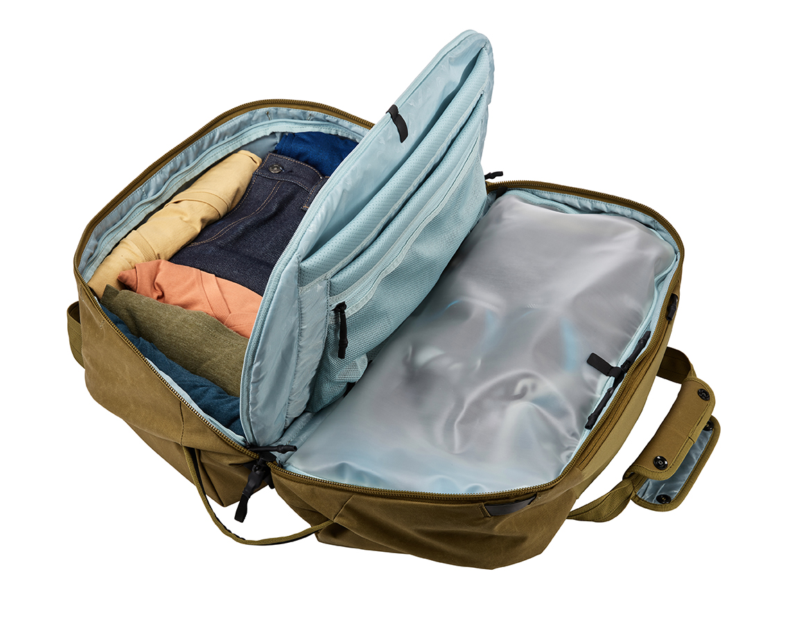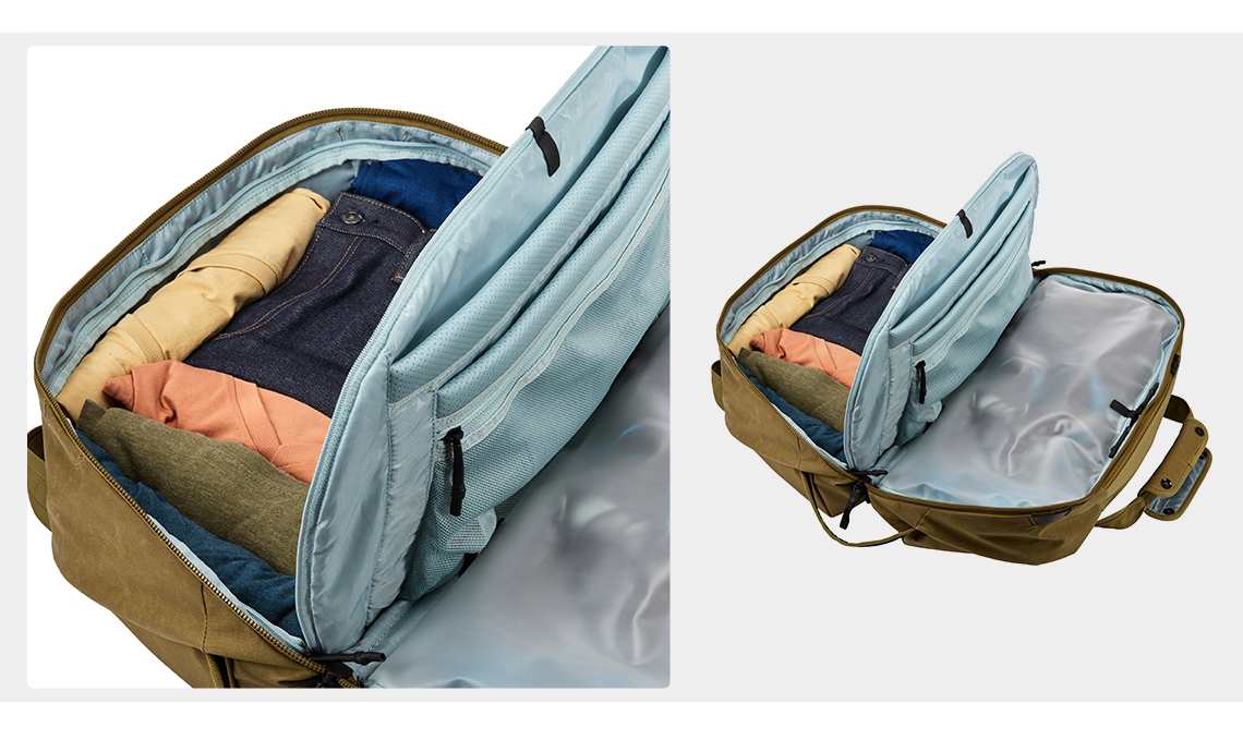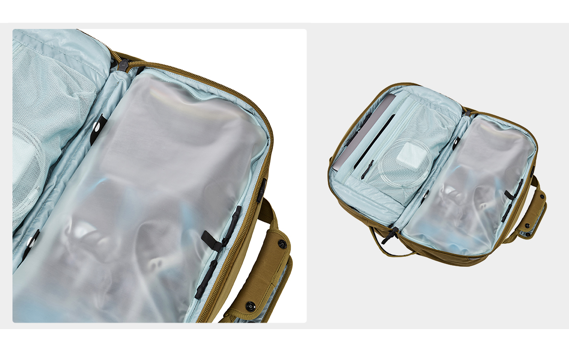 Thule Aion 35L 手提行李袋可將行李衣物和其他物品分隔收納,輕鬆將日常用品與戶外裝備分開存放,是戶外旅行的完美背包。內部設置可拆可捲的隔板設計,可將髒污物品分開存放,且容易清理,亦可拆除捲入底部,輕鬆轉換成一個大收納空間。