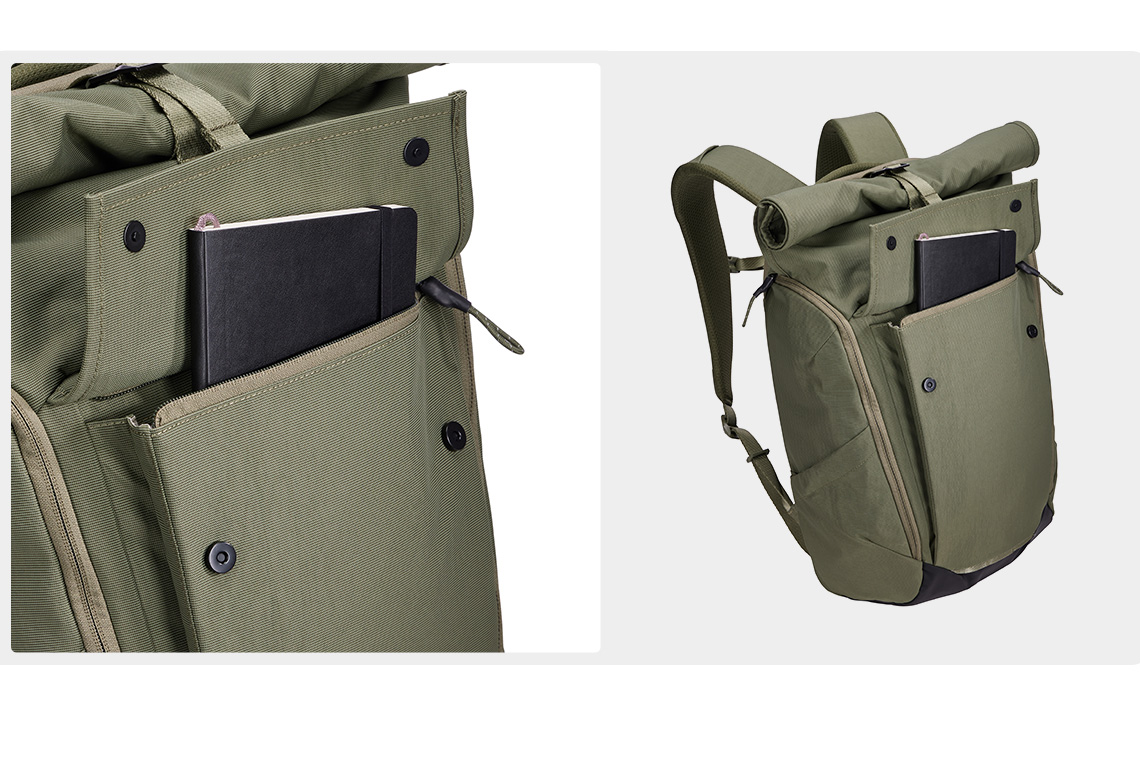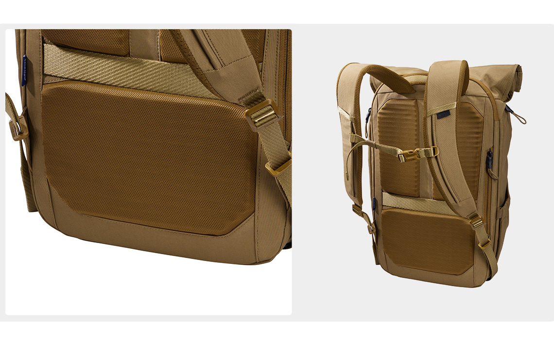 提供襯墊式筆電收納層和平板收納層,妥善保護設備,可從上方捲蓋開口拿取,或是後方拉鍊口袋拿取筆電。大容量收納空間可放入 A4 文件,可快速從側邊拉鍊拿取。
