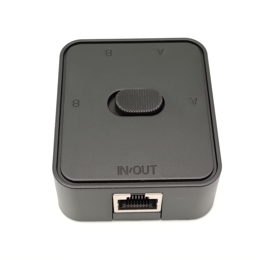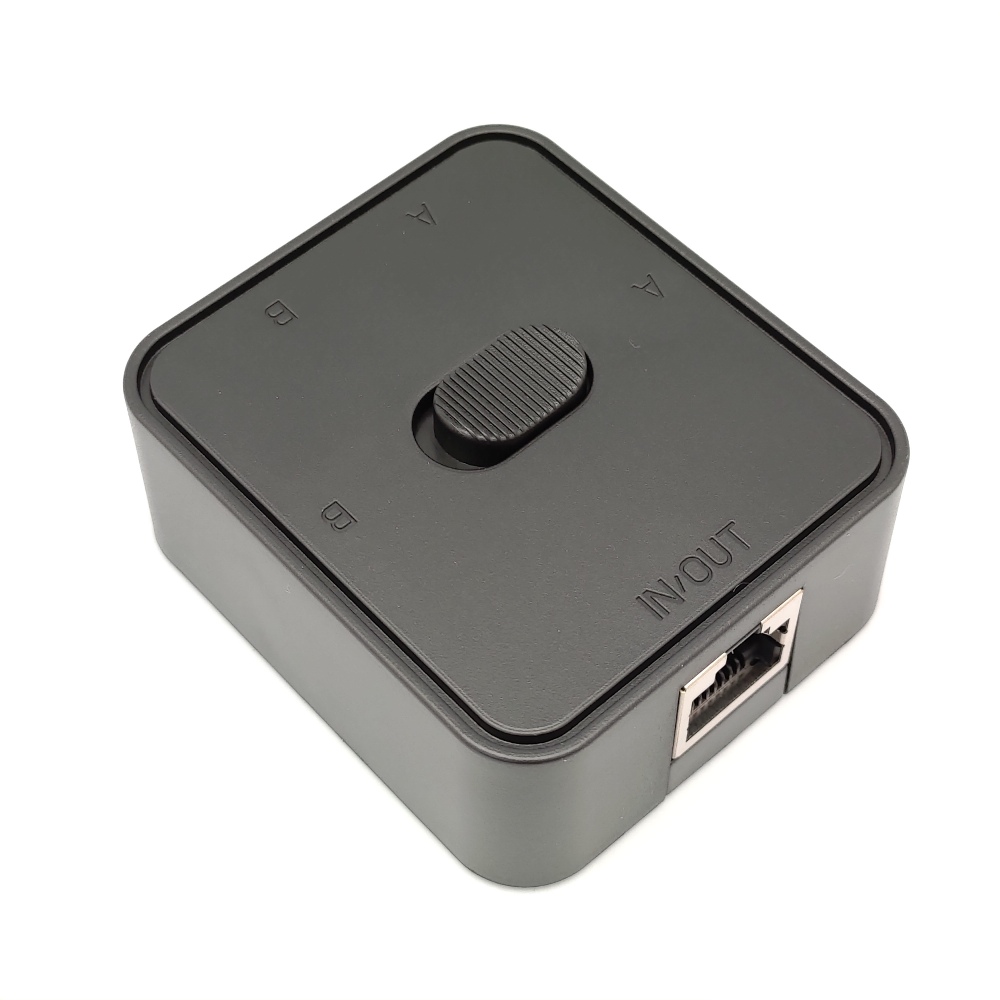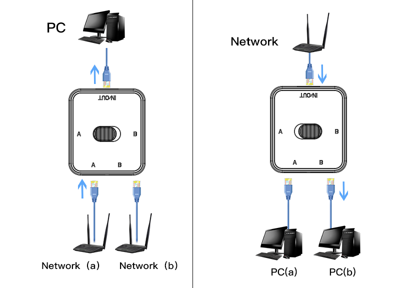 功能特點◆ 可應用於主機切換內網與外網環境◆ 頻寬1GHz,可做為二進一出或一進二出(2選1),同時間只能連接一個通道◆ 使用安裝簡便,使用單一開關快速切換◆ 請搭配使用 Gigalan 等級 Cat6 網線◆ 免外接電源,對於網路訊號不會有電訊干擾◆ 商品尺寸:6cm x 5cm x 2cm連接示意圖 - 左圖為一台電腦從2個網路擇一使用,右圖為兩台電腦擇一連接網路