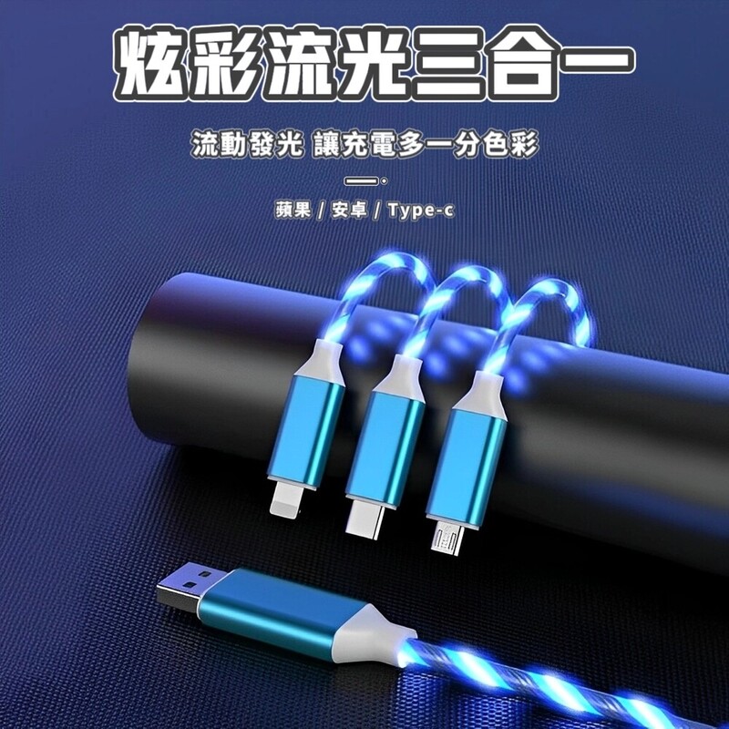 智能斷電款三合一流光充電線 充電秒閃氛圍流光 夜晚充電不再摸黑 滿足所有手機型號