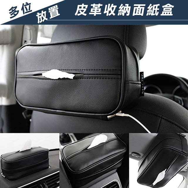 車上面紙盒總是找不到好的地方放嗎?汽車多用皮革收納面紙盒-多位可放置,椅背、中控台、遮陽板、手扶箱隨你習性喜好放置,下方收納袋還可放置手機等小物,不裝紙巾時還可收納物品,黑色皮革荔枝紋,高質好搭,絕對配的上您的愛車!