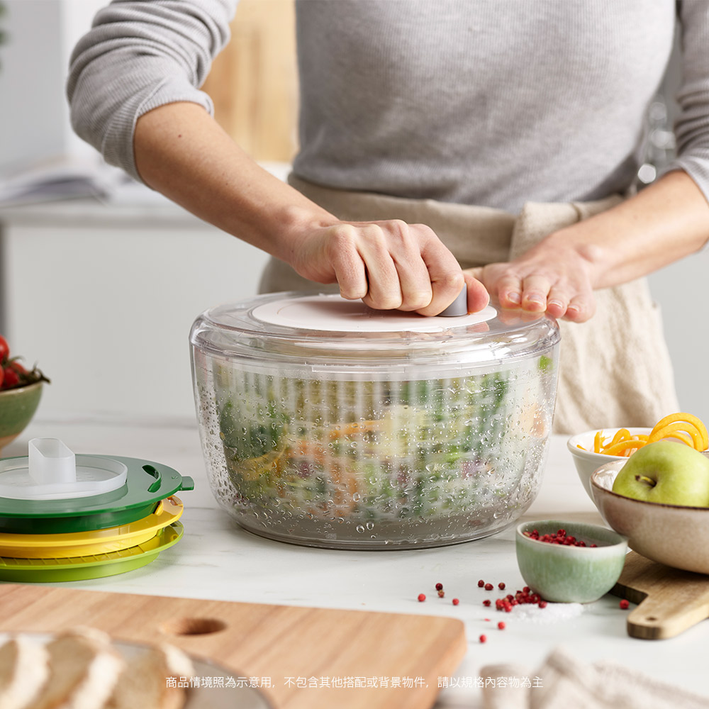 內容物:收集盆x1、沙拉旋轉器x1、螺旋切片刀片x1、切片刀片x1、切絲刀片x1、瀝水籃x1、護指套x1
