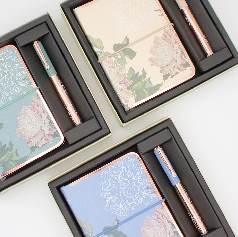 透過ARTEX30餘年的設計經驗與製作技術,將畫作以轉印與絲印的技術,重現於鋼珠筆與筆記本之上。利用簡單的線條,將牡丹花勾勒於鋼珠筆身,沒有過度複雜的顏色,單純以白色線條顯現出牡丹花的華美:筆記本部分則將解構後的牡丹花以虛實交錯的方式呈現於筆記本上,強調出原作中的立體感及層次感,特製的玫瑰金屬邊框則增添了富貴平安的意象。
