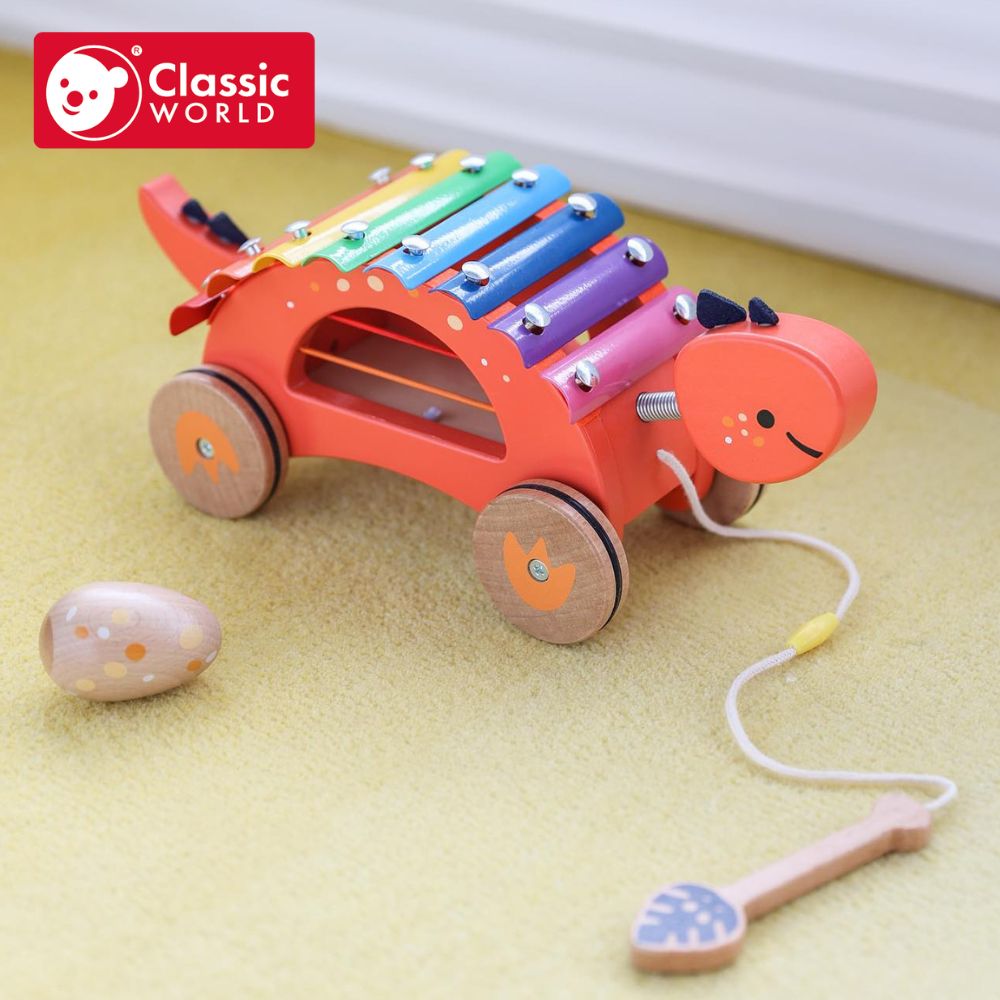 精細動作技能: 拖拉恐龍和敲擊木琴的過程需要孩子運用手部力量和協調能力,有助於精細動作技能的發展。