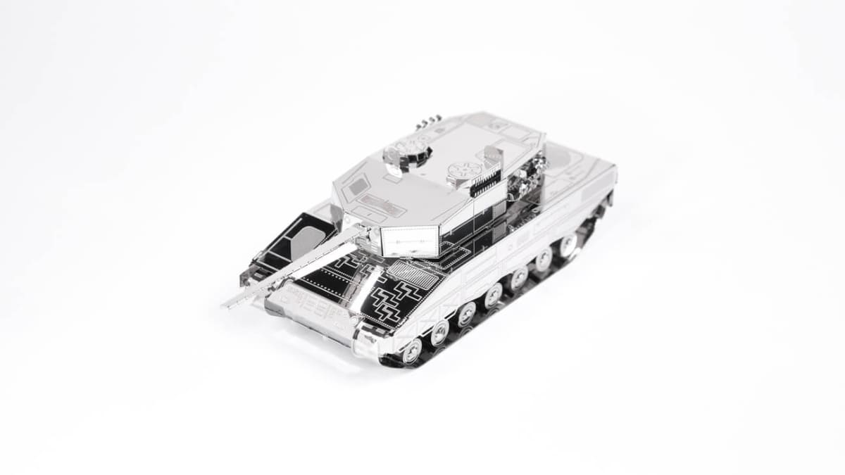 這款「豹2」模型完整呈現這款傳奇中型坦克的經典設計,包括獨特外型、炮塔與底盤(6顆滾輪與標誌性懸吊系統)、艙門、散熱格柵及武器。所有表面細節與紋理皆採電化學蝕刻技術處理,使模型更接近真實戰車的外觀。模型所有零件皆採用食品級不鏽鋼製成,常用於食品、消費品與玩具產業,安全無毒,對組裝者毫無危害。精密切割技術讓組裝過程無需額外工具、焊接或黏膠。