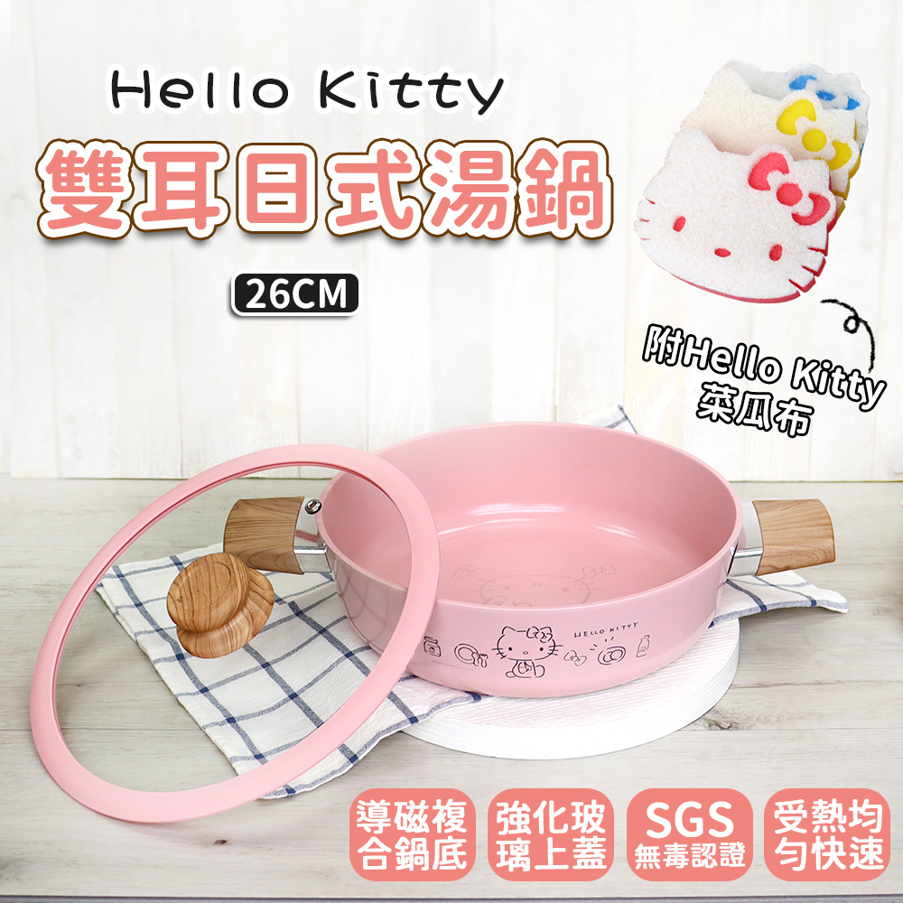 【HELLO KITTY】粉萌鍋具組-26cm日式雙耳湯鍋/壽喜燒鍋/平煎鍋+三入造型菜瓜布
