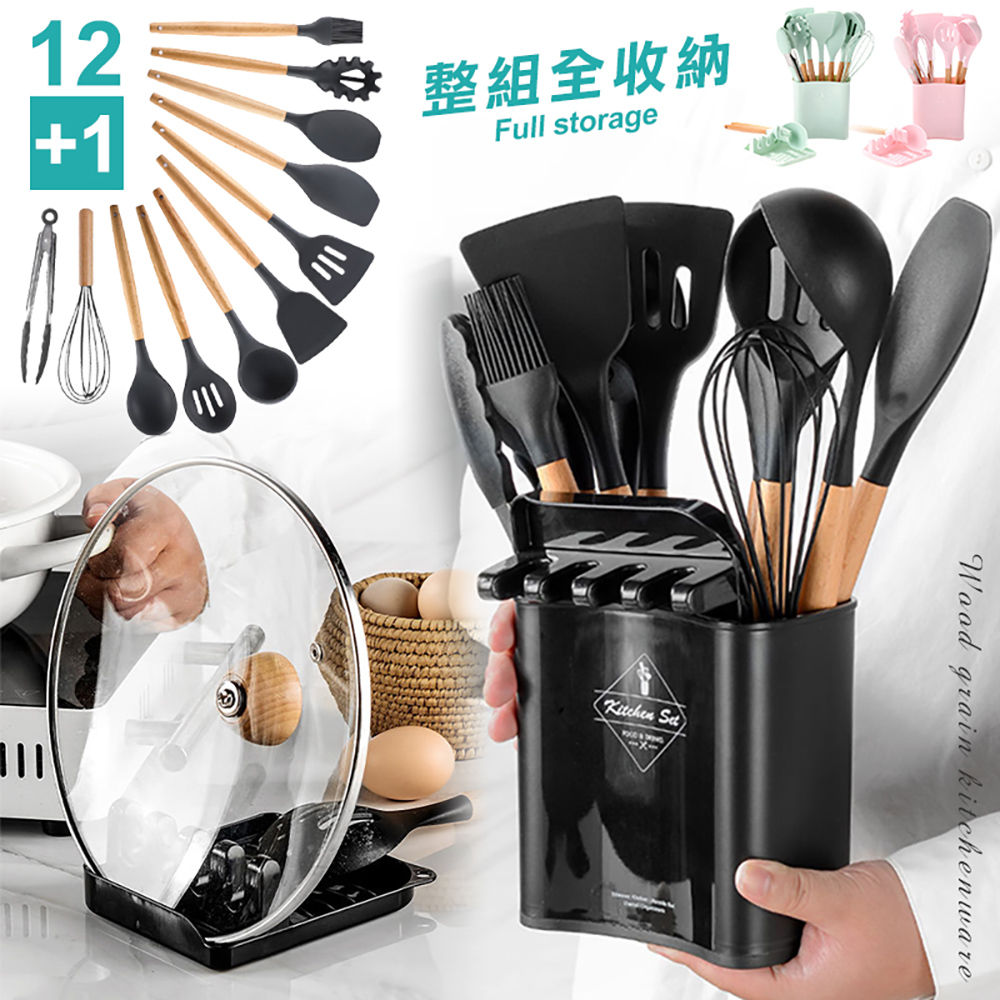 - 新升級!不沾鍋矽膠鍋鏟廚具12+1件組 豪華全配完整12件加贈超實用鍋蓋鍋鏟架,讓你做菜不怕少廚具,整潔又乾淨,新款寬形收納桶,止滑好移位好抽取,整組還可全收納,隔熱義式櫸木柄,質感有品味,食品用矽膠材質,耐熱230度不傷鍋具,絕對是整潔有效率廚房必備餐具組~