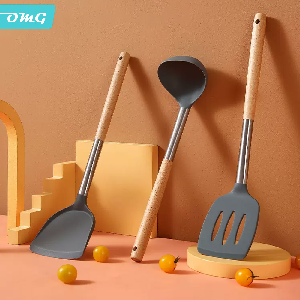 OMG 北歐櫸木耐熱矽膠廚具3件組 不沾鍋中式炒鍋鏟(鍋鏟/湯勺/漏鏟) 灰色