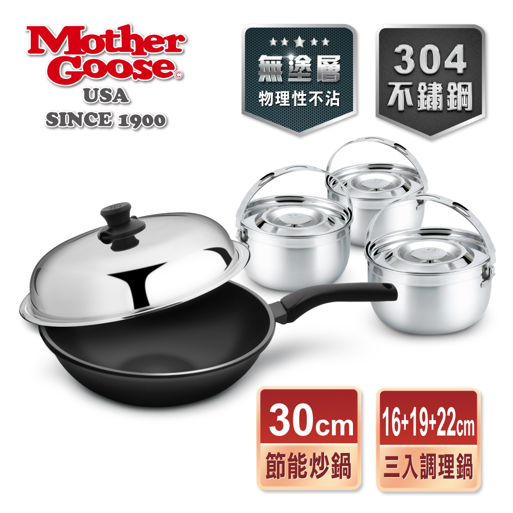 ◆ 內容物:美國鵝媽媽 Mother Goose 凱芮304不鏽鋼三入調理鍋(16+19+22cm)