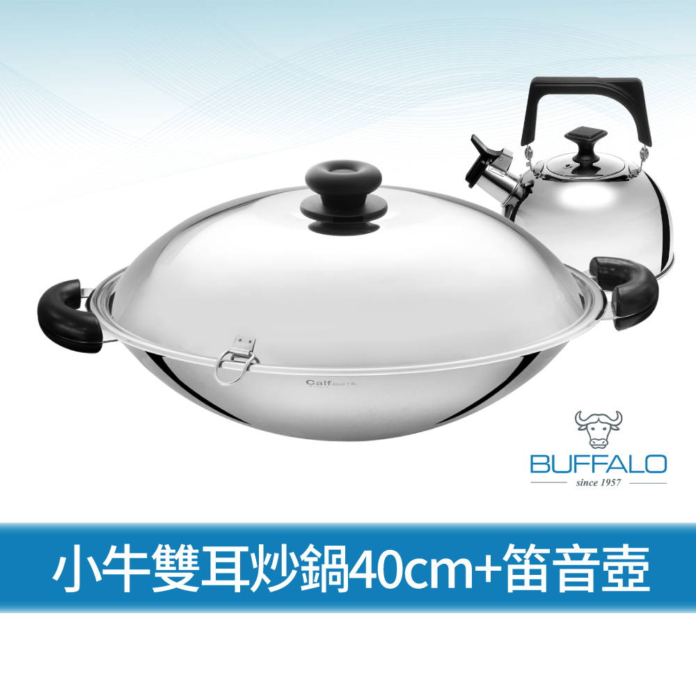 buffalo牛頭牌 小牛雙耳炒鍋40cm+笛音壺5L(304不鏽鋼 大容量 防刮耐用 健康烹調)