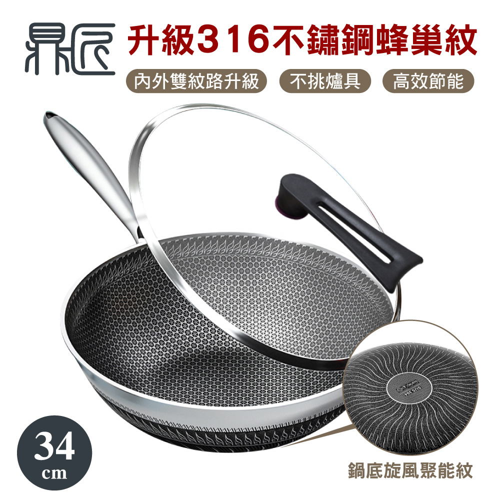 316不鏽鋼雙面蜂巢紋炒鍋-34cm,附可立式感溫玻璃蓋
