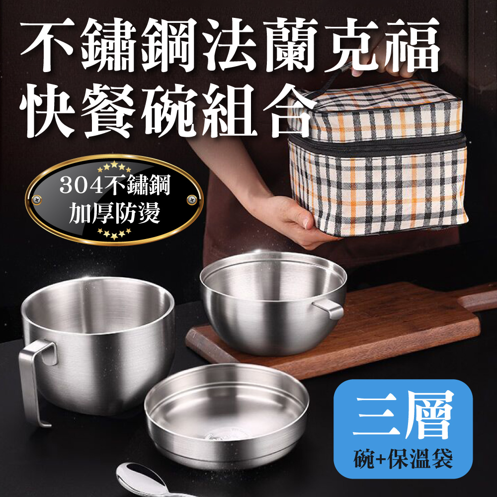 商品名稱:【新錸家居】法蘭克福304不鏽鋼泡麵碗飯湯碗便當盒-三層款,加購保溫袋