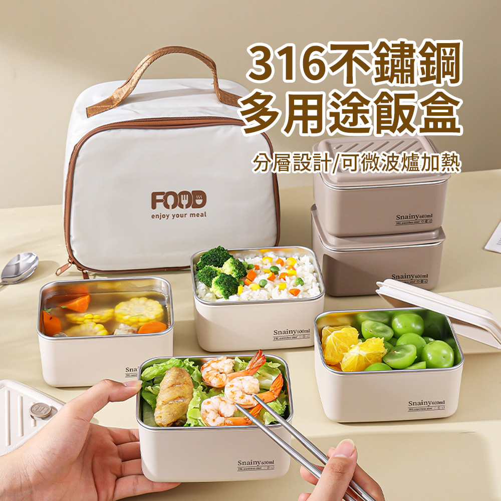 SUNORO 316不鏽鋼便當盒 注水保溫密封飯盒 保鮮盒/餐盒/午餐盒 600ml x 2入組 (可微波/可冷藏/附餐具保溫袋)