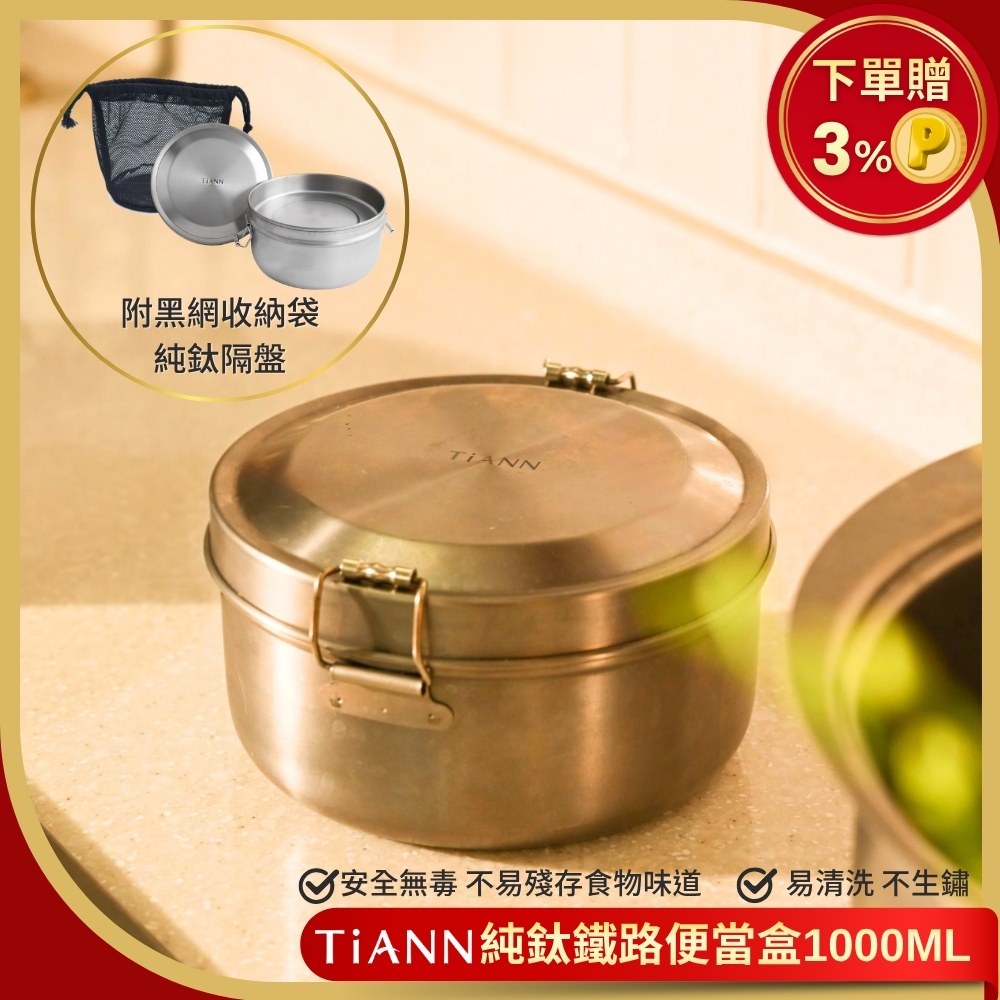 TiANN 鈦安 不發霉不生鏽便當盒【 純鈦餐具】鈦聰明 純鈦 鐵路便當盒組 1000ml (扣式密封鈦蓋) 附贈 黑網收納袋