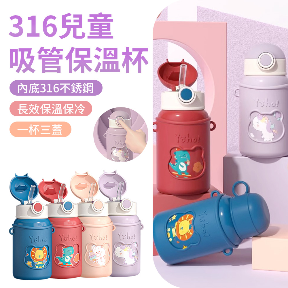 TLYS-J 雙12 316不鏽鋼數顯兒童保溫杯 450ML 三蓋兒童水壺 真空保冷保溫瓶 吸管飲水杯 (贈便攜杯套背帶)
