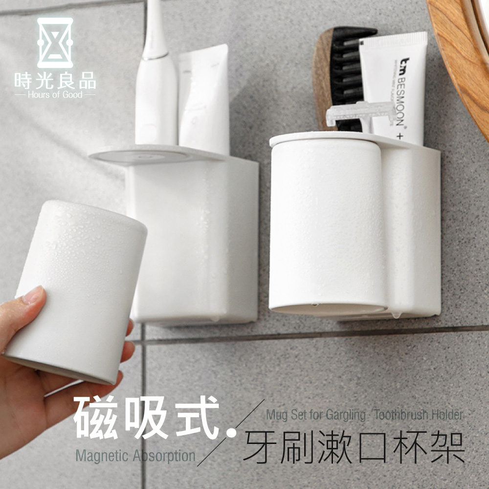 【時光良品】高質感極簡風磁吸式漱口杯架組(免釘無痕北歐牙刷收納架 懸掛瀝水置物架 免打孔省空間)