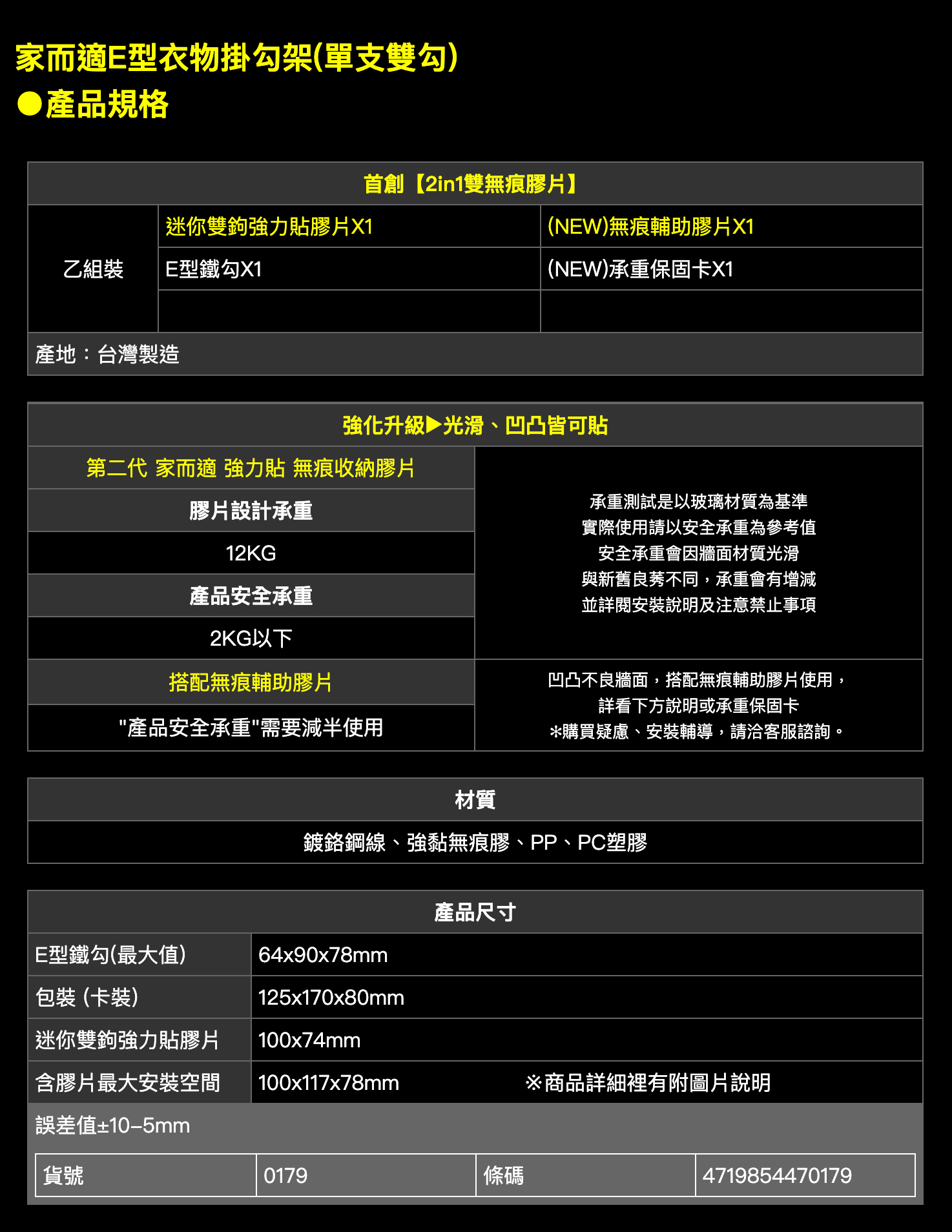 一入裝含:E型鐵勾X1、迷你雙鉤強力貼膠片X1、無痕輔助膠片X1、承重保固卡X1