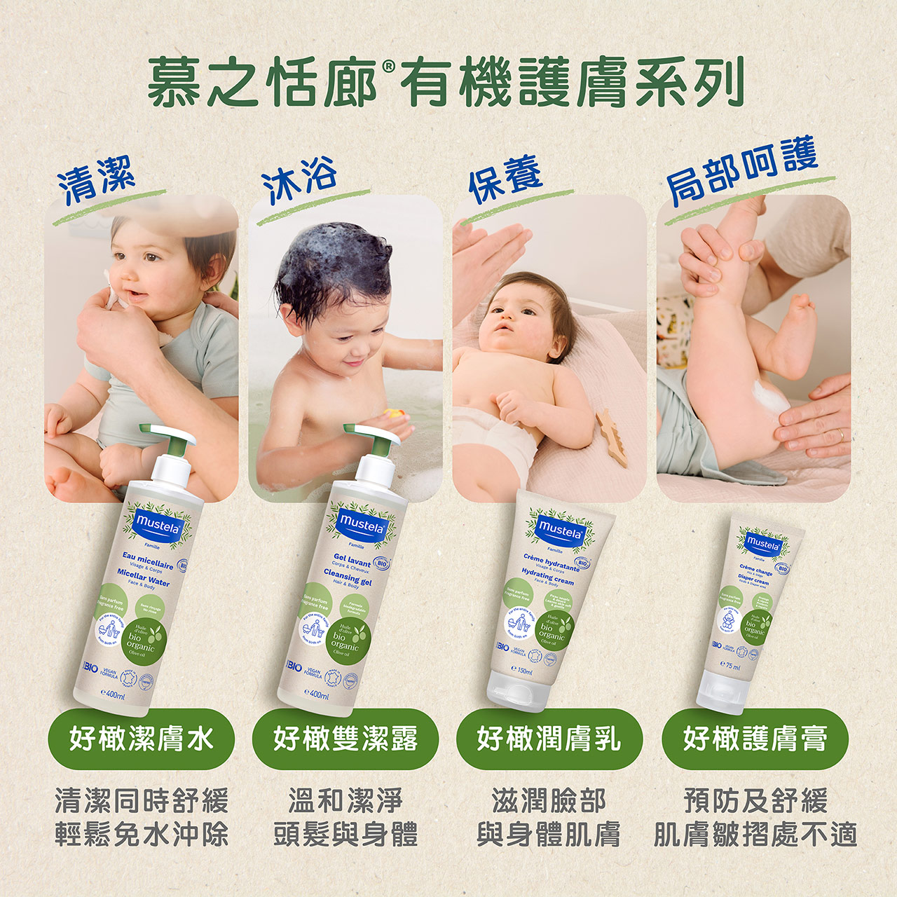 - 無添加香精、精油、礦物油成分,出生即可開始使用,全家人及孕媽咪亦適合