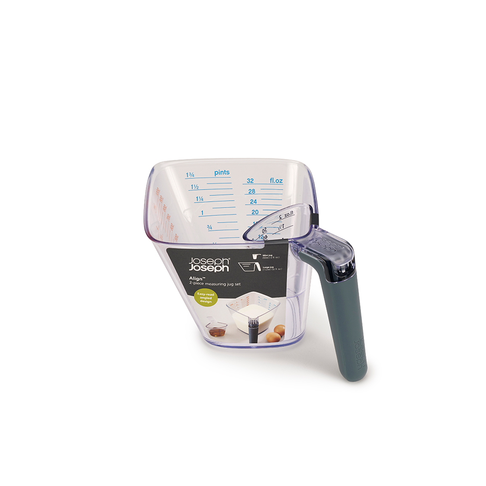 Joseph Joseph 二合一量杯組 內容物:1L大量杯x1、50ML小量杯x1 產地:中國 材質:SAN(苯乙烯-丙烯腈塑膠)、TPE(熱塑性彈性體) 使用須知: ●不可放洗碗機、烘碗機、微波爐