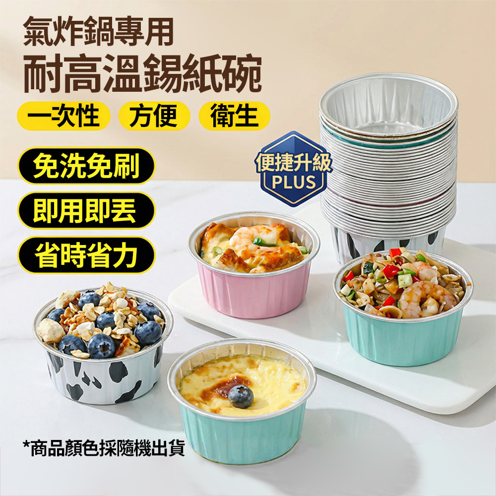 【CS22】氣炸鍋專用耐高溫錫紙碗-50入 顏色:隨機出貨 材質:鋁箔、食品接觸級環氧樹脂 尺寸:如圖片所示 重量:2g(單)/125g 有效期限:3年 產地:中國 材積:9.5*9.5*12cm