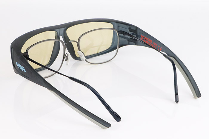 本產品為套鏡型式設計,可先配戴原有度數的眼鏡,再戴上此濾藍光眼鏡;也可直接配戴。鏡框上緣、下緣、兩邊側緣均有遮擋光線的包覆設計,可阻擋風沙、飛沫。適用內鏡尺寸:寬135x高38mm。