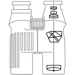 Roof 屋脊式稜鏡系統的望遠鏡形狀呈現如英文字「H」,物鏡間距離相當於目鏡間距離,為使物鏡到目鏡的光線路徑成一直線,對兩個稜鏡的距離較近,必須要求其精密度。此種稜鏡系統較複雜,內部鏡組排列更為緊密,優點是體積小且堅固。