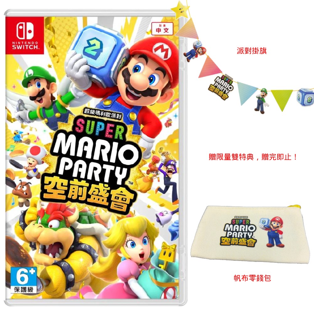 預購特典數量有限,如送完恕不另行通知系列史上內容最豐富的派對即將開幕!《超級瑪利歐派對 空前盛會》。全新的瑪利歐派對舞台是巨大的度假勝地島嶼。首先來介紹目標是比對手獲得更多星星以拿下勝利的桌遊地圖。在利用電扶梯於各樓層之間進行移動的「令人興奮的購物中心」之中,當進入限時特賣期間,就是以半價購買星星的大好機會!在賽道上駕駛車子前進的「骰子快速道路」之中,若使用了道具「音速骰子」,最多可以一口氣前進40格。在「栗寶寶島」之中,路線將會因潮起潮落而改變。一旦栗寶寶火山噴發,情勢可能會一口氣逆轉……!?除了全新的五個桌遊地圖,還會有兩個重製桌遊地圖在本作登場。小遊戲除了動作、競賽、益智對戰等各式各樣的類別,還有使用揮動、傾斜Joy-Con等各種操作方法的項目,將有超過110種玩法收錄其中。另外……!本作也收錄了系列史上最多可以20人一同競賽的線上模式,和對手一起挑戰小遊戲來決勝負,目標是拿下第1名。是否能在20人一同競賽的生存戰中存活下來呢……?除此之外,還有更多全新遊玩內容!一切都是系列最豐富等級的《超級瑪利歐派對 空前盛會》,預定於2024年10月17日(四)發售!